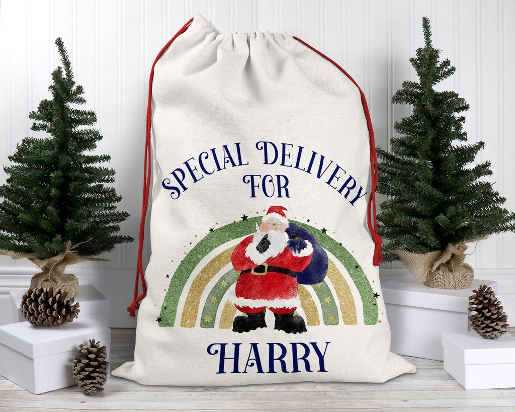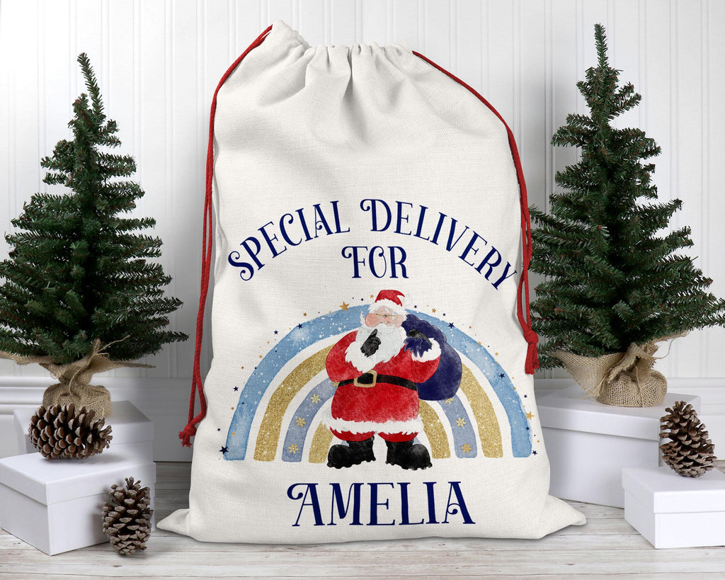 Make Christmas morning extra magical with our Special Delivery from Santa sack β featuring a beautifully illustrated Santa beside a shimmering blue and gold rainbow, ready to deliver gifts straight from the North Pole!